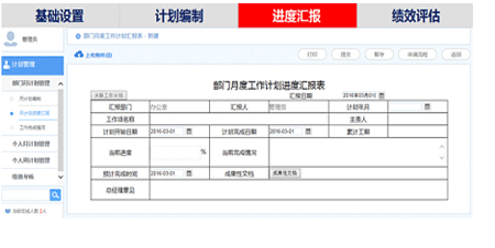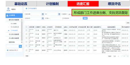 進度管理系統(tǒng)以制定工作目標、計劃執(zhí)行匯報、績效評估為主線,實現(xiàn)對部門工作計劃以及個人工作計劃的全面管理