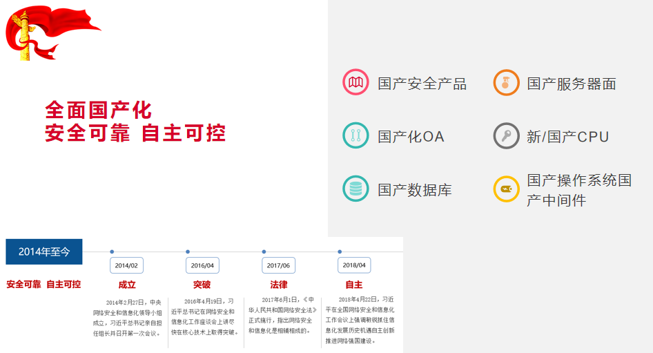 隨著信息安全問題日益突出,信息安全已上升至國家戰(zhàn)略,自主可控,國產(chǎn)化替代已成為歷史趨勢。2019年開始我國信息、網(wǎng)安領(lǐng)域企業(yè)逐漸發(fā)力“安全可靠工程”,安全可靠工程戰(zhàn)略意義在于證明我國具有安全可靠關(guān)鍵系統(tǒng)、關(guān)鍵應(yīng)用及關(guān)鍵軟硬件產(chǎn)品的研發(fā)集成能力,能夠初步實現(xiàn)對國外信息技術(shù)產(chǎn)品的全方位替代,在新的歷史起點上構(gòu)建起網(wǎng)絡(luò)安全的“銅墻鐵壁”。在黨政辦公及國家重要信息系統(tǒng)推進國產(chǎn)化替代,實現(xiàn)安全可靠、自主可控,保障國家信息安全的工作已全面展開。