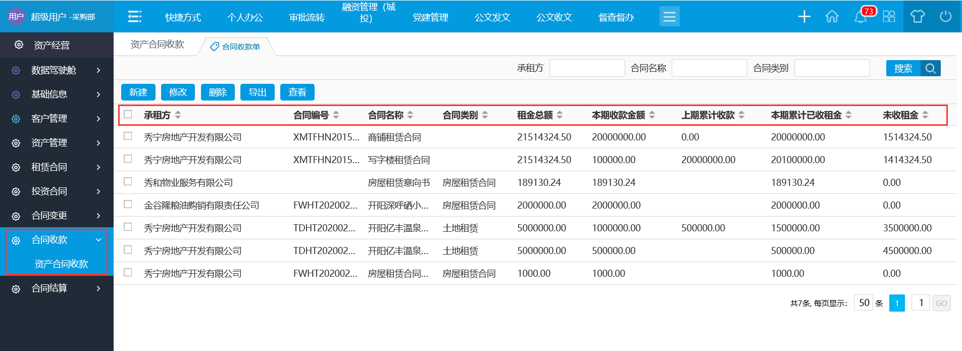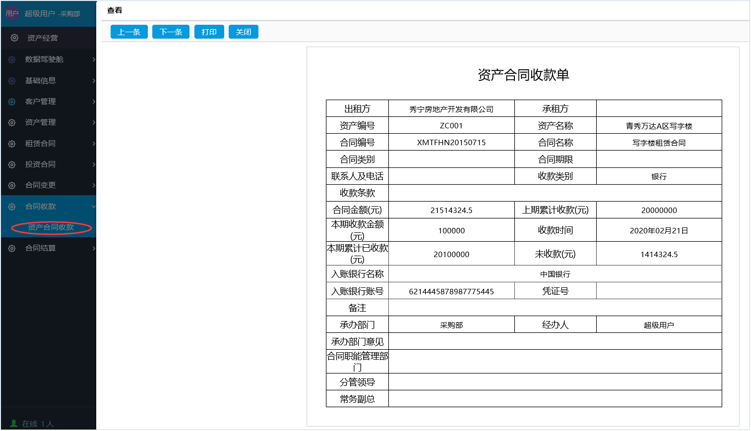 通過(guò)系統(tǒng)平臺(tái)記錄每一個(gè)資產(chǎn)物業(yè)有效租賃合同每一筆收租信息,系統(tǒng)支持查詢關(guān)聯(lián)自動(dòng)獲取租賃合同基本信息、歷史收款信息、累計(jì)收款金額、剩余未收款金額,每次收款記錄登記完畢后系統(tǒng)自動(dòng)更新收款明細(xì)臺(tái)賬,支持在線查詢跟導(dǎo)出。