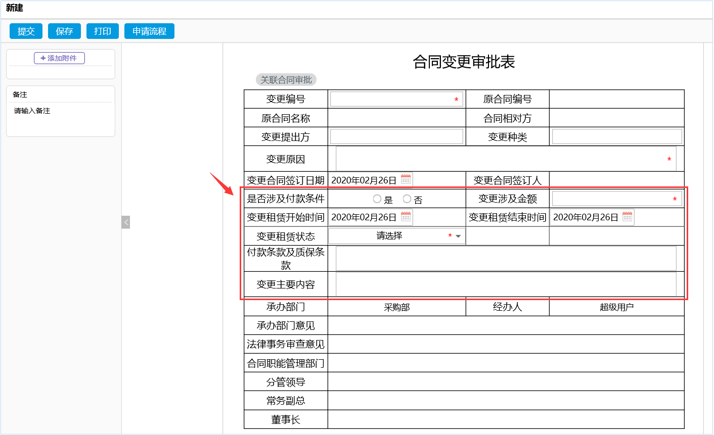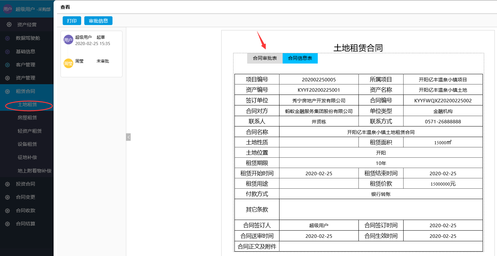 系統(tǒng)支持資產(chǎn)租賃期間對(duì)合同信息變更的電子化流程審批處理,包括租戶信息變更、租賃年限變更、租金變更等,系統(tǒng)保留原合同信息,自動(dòng)計(jì)算修改預(yù)計(jì)合同累計(jì)收益。