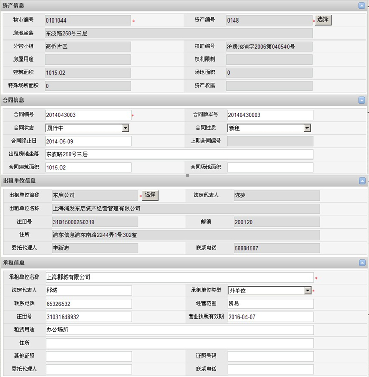 通過(guò)系統(tǒng)對(duì)各類運(yùn)營(yíng)性資產(chǎn)的租賃合同進(jìn)行電子化流程簽審,包括土地租賃、廠房租賃、房屋租賃、輕資產(chǎn)租賃、設(shè)備租賃等,自動(dòng)生成租賃合同信息臺(tái)賬庫(kù),主要管理資產(chǎn)的租賃合同文件、合同基礎(chǔ)信息、資產(chǎn)使用狀態(tài)、承租模式(委托、 協(xié)議、招租等)、租金費(fèi)用、租期、支付方式、預(yù)期收益、租戶等信息進(jìn)行統(tǒng)一管理