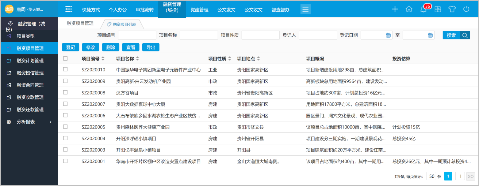 是對于達(dá)到立項(xiàng)條件的融資項(xiàng)目進(jìn)行統(tǒng)一管理,可抵押的資產(chǎn)進(jìn)行全面掌握,方便及時(shí)統(tǒng)計(jì)可用資源,融資項(xiàng)目分別有能源類、基礎(chǔ)建設(shè)類、公益類等,對融資項(xiàng)目進(jìn)行詳細(xì)登記統(tǒng)一全面掌控,為融資計(jì)劃和融資合同建立基礎(chǔ)資料庫