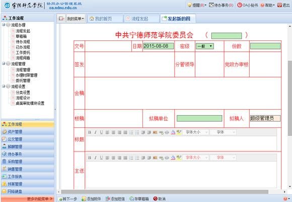 當(dāng)前,社會(huì)已全面進(jìn)入高速信息時(shí)代,如何運(yùn)用信息化手段提高管理工作的透明度,如何對(duì)管理工作的效能進(jìn)行科學(xué)監(jiān)督和考核,充分發(fā)揮管理育人的正能量,已經(jīng)成為高校內(nèi)部迫切需要解決的問題。寧德師范學(xué)院順應(yīng)高校管理手段的創(chuàng)新和變革的需要,全面梳理和推進(jìn)相關(guān)工作,探索建立提升管理干部執(zhí)行力、增強(qiáng)督辦和監(jiān)察力度的全新工作平臺(tái),形成提高管理效率和效能的全新的工作機(jī)制。2014年12月,寧德師范學(xué)院對(duì)oa市場(chǎng)進(jìn)行考察和多次研討后,決定與匯高oa公司合作。